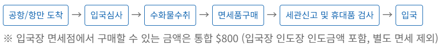 | 입국장 면세점 | 공항만 입국장에 설치되어 우리나라 입국 시에도 이용할 수 있는 면세점으로 면세한도($800) 내에서 구입 가능합니다. |