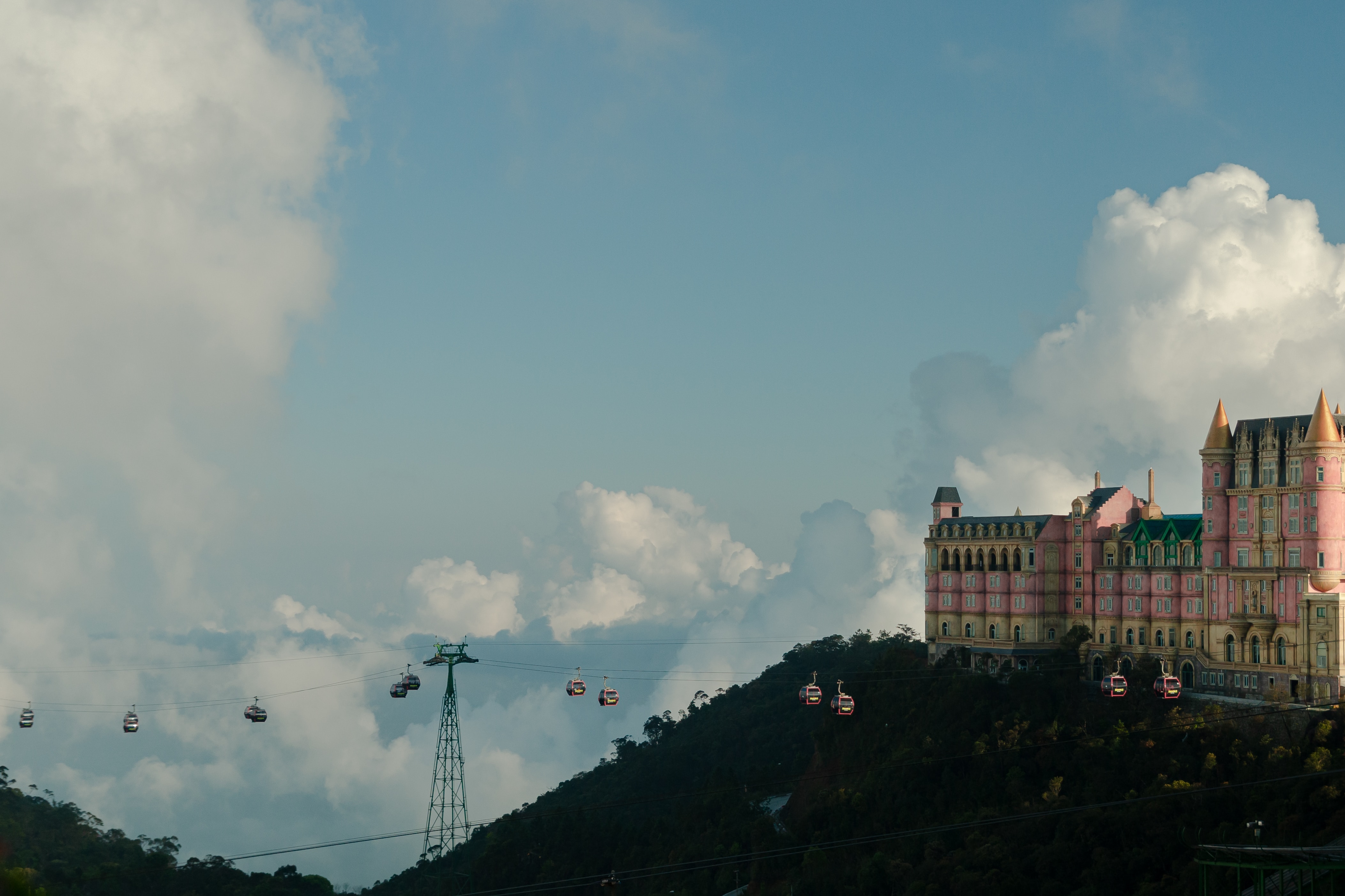 케이블카는 바나힐 정상까지 오르면서 5.8km에 걸쳐 20분 동안 아름다운 경관을 감상할 수 있습니다. 산 정상에 도착하면 프랑스 스타일의 마을과 독특한 디자인의 골든브릿지 그리고 산책로를 따라 걷거나 놀이기구를 타면서 다양한 체험 활동을 할 수 있습니다.