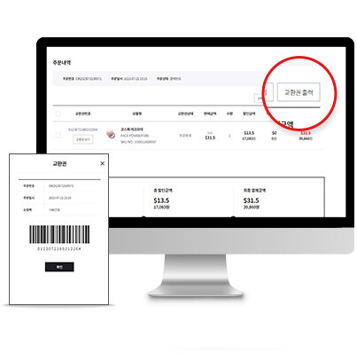 | 결제완료 후 주문완료 페이지에서 교환권 출력 | 교환권 출력이 불가한 경우에는 교환권 번호 메모하거나 모바일 앱(SNS)으로 진행합니다. |