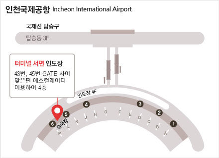 | 43번, 45번 GATE 사이 맞은편 에스컬레이터 이용하여 4층 | 032-743-2722 |